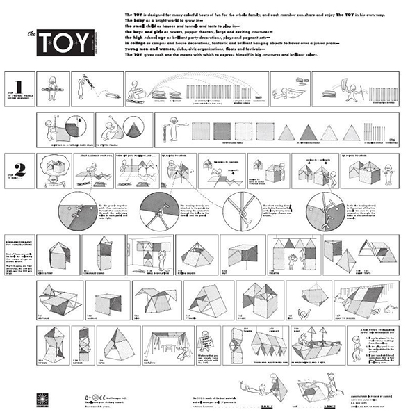 チャールズとレイ・イームズは、1951年にTigrett Industries社で初めてこの製品を生産しました。小売店で製造販売した最初のおもちゃでした。 イームズは、すべてのプロジェクトで行うとおり、The Toyを開発する際に多くのオプションを検討しました。Eames Houseの外にあるRayの有名な写真に見られるように、ボール紙の三角形を試し始めました。その後、より大きな構造を構築できるように四角形を追加しました。おもちゃが最初に生産に入ったとき、それは最近開発されたプラスチック被覆紙を使用して作られました。その後、この玩具は、この再発売された製品が今日作られたものと同じ素材で作られています。
